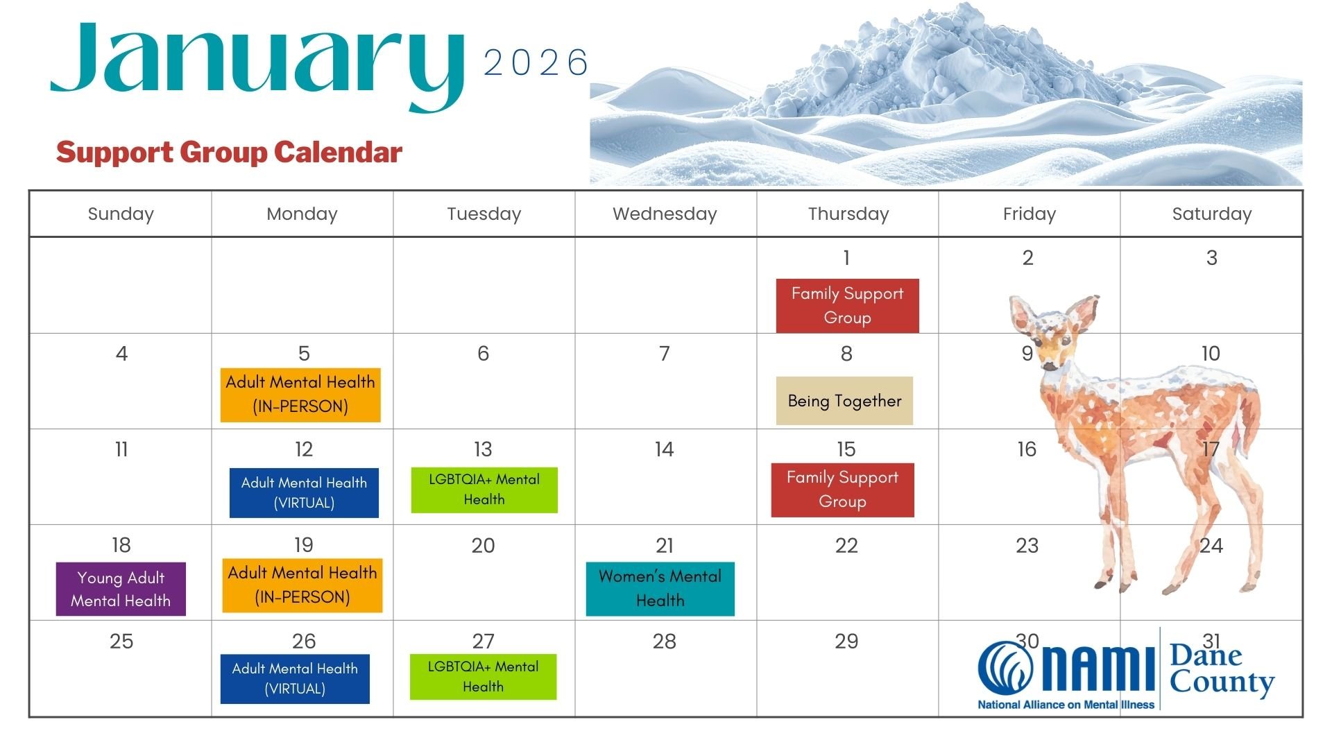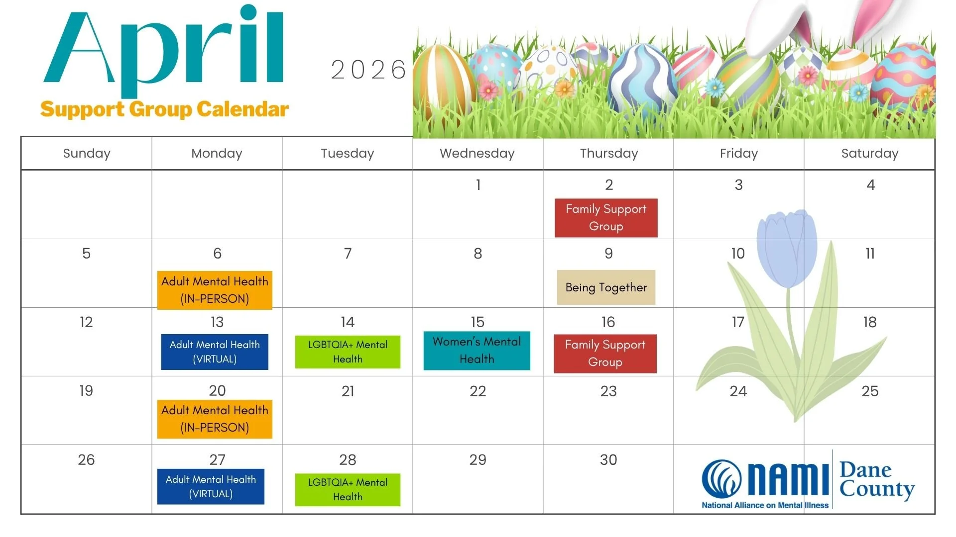 NAMI Dane County Support Groups are provided at no cost to participants. This contributes to our mission of providing access to mental health support in Dane County and the surrounding areas.