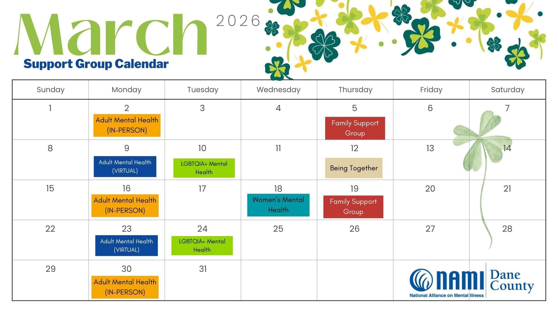 Join us if: You live anywhere in Wisconsin and are looking for support from others. Open to all adults with any diagnoses or mental health concerns. This group is hosted by NAMI Dane County once a month, but is a group operated through NAMI WI that is meant to support the mental health of individuals all over the state, especially if you live in a county without support group access. Also open to folks who live in Dane County.